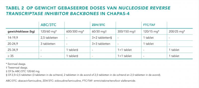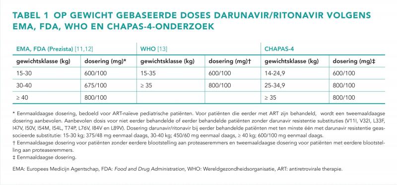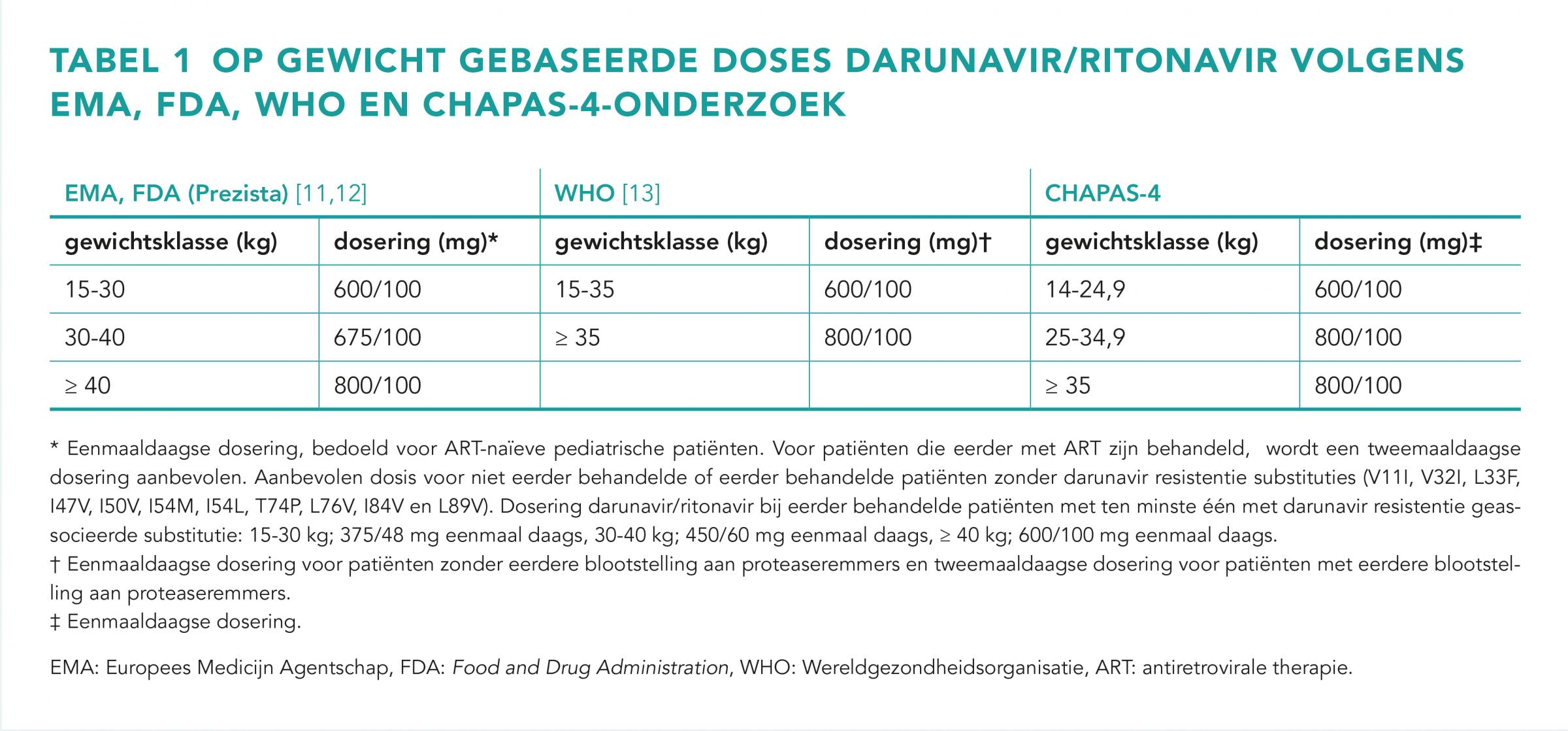 Bij kinderen ouder dan 3 jaar en met een gewicht van minimaal 14 kg, die niet eerder zijn blootgesteld aan PI’s, kan eenmaal daags darunavir/ritonavir worden toegediend [4]. De aanbevolen doseringen voor kinderen variëren echter tussen het Europees Medicijn Agentschap (EMA), de Food and Drug Administration (FDA) en de WHO (tabel 1). In dit CHAPAS-4-onderzoek werd een vereenvoudigd doseringsschema van eenmaal daags geïmplementeerd, vergelijkbaar met de aanbeveling van de WHO. Kinderen met een gewicht ≥ 25 kg kregen echter een volwassen dosering van 800/100 mg darunavir/ritonavir, terwijl de WHO deze dosering pas vanaf een gewicht van 35 kg aanbeveelt.