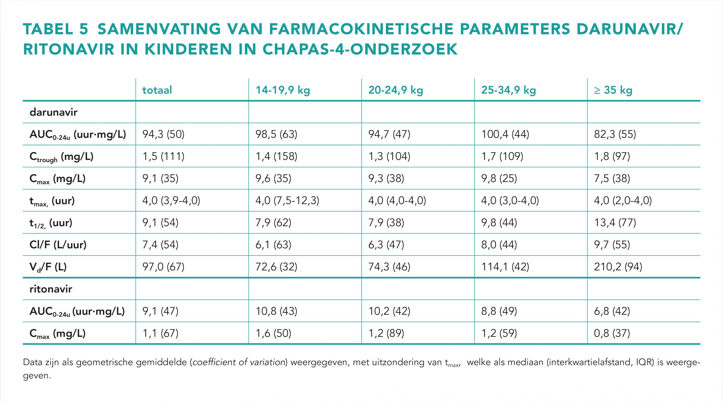 In dit onderzoek presenteren we de resultaten van een intensieve PK-subonderzoek van eenmaal daags darunavir/ritonavir, als onderdeel van het CHAPAS-4-onderzoek. We vergeleken de in dit onderzoek bereikte blootstellingen met eerder gerapporteerde blootstellingen bij volwassenen en onderzochten het effect van NRTI backbones op de farmacokinetiek van darunavir.