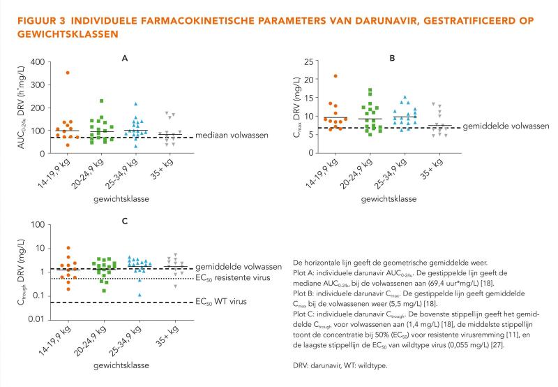 Adequate blootstelling werd gedefinieerd als een GM AUC0-24u bij kinderen die vergelijkbaar was met de mediaan AUC0-24u bij volwassenen. Daarnaast werd beoordeeld of Ctrough van darunavir bij alle kinderen hoger lag dan de 50% effectieve concentratie (EC50) voor wildtype virus (0,055 mg/L) [18]. Een variantieanalyse op log-getransformeerde farmacokinetische parameters werd uitgevoerd middels een one-way ANOVA (Analysis of Variance)-test om farmacokinetische parameters van darunavir (AUC0-24u, Ctrough, Cmax) tussen verschillende NRTI backbones en gewichtsklassen te testen (homogeneity of variance [P > 0,05]). Welch’s ANOVA werd toegepast wanneer er niet voldaan werd aan de aanname van homogeniteit van variantie (SPSS, v25). In het geval van een significant verschil, werd een Games-Howell post-hoc test uitgevoerd.