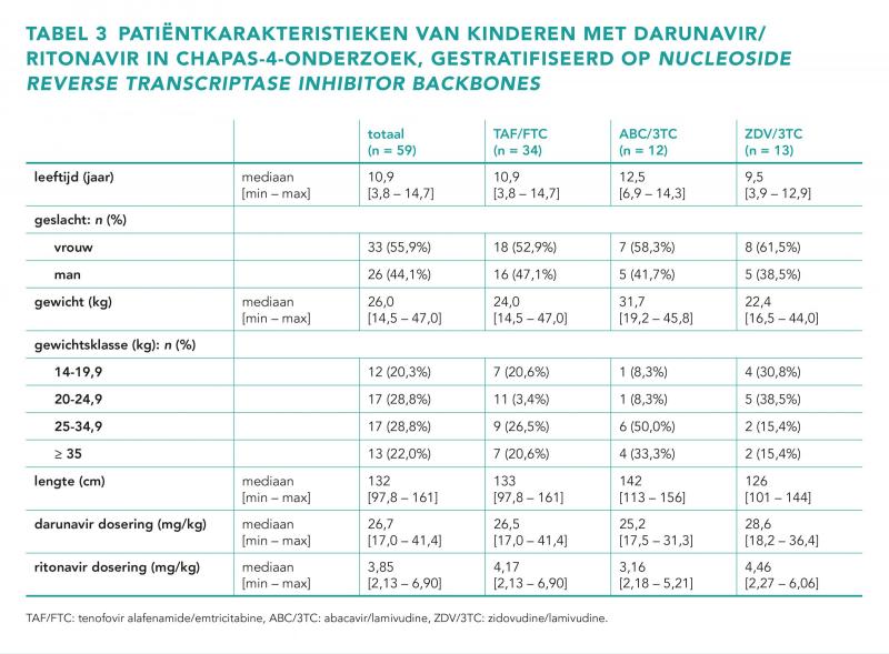 Tussen januari 2019 en maart 2021 werden 59 kinderen geïncludeerd in de darunavir/ritonavir-arm. De mediane leeftijd was 10,9 jaar (bereik 3,8-14,7) en het mediane gewicht 26,0 kg (bereik 14,5-47,0), en 56% was vrouw. Eén van de 491 darunavir C0 plasmaconcentraties lag onder de LLOQ, waardoor deze deelnemer werd uitgesloten van de NCA vanwege vermoedelijke therapieontrouw. Tabel 3 geeft de patiëntkarakteristieken weer voor alle kinderen in de darunavir/ritonavir-arm.